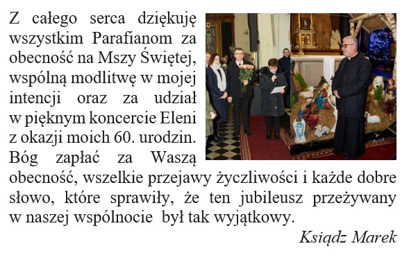 - Dziękuję za posprzątanie kościoła i ofiary na kwiaty, a do posprzątania zapraszam w piątek 21.02. na godz. 18:45 mieszkańców Kozich Lasek: nr. 29,30 oraz ul. Gryczana, Pszeniczna.