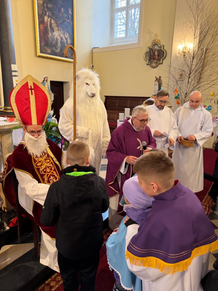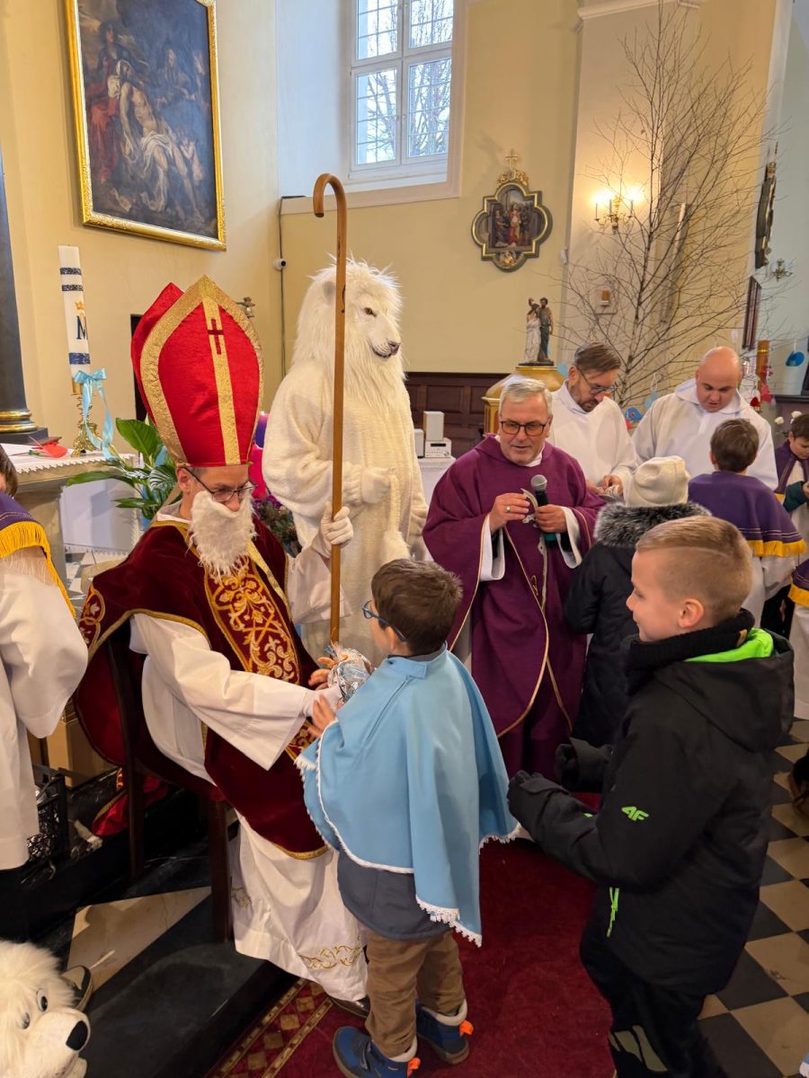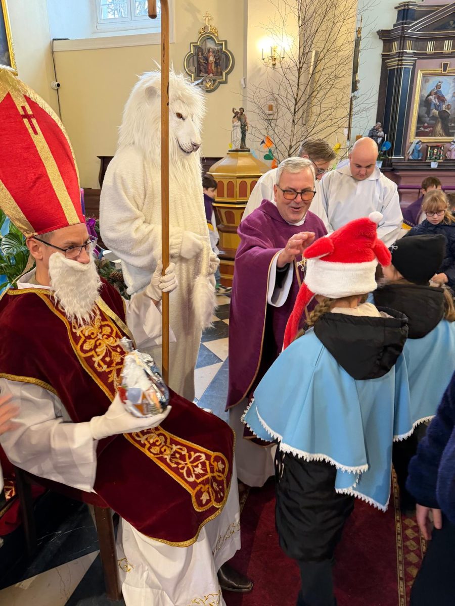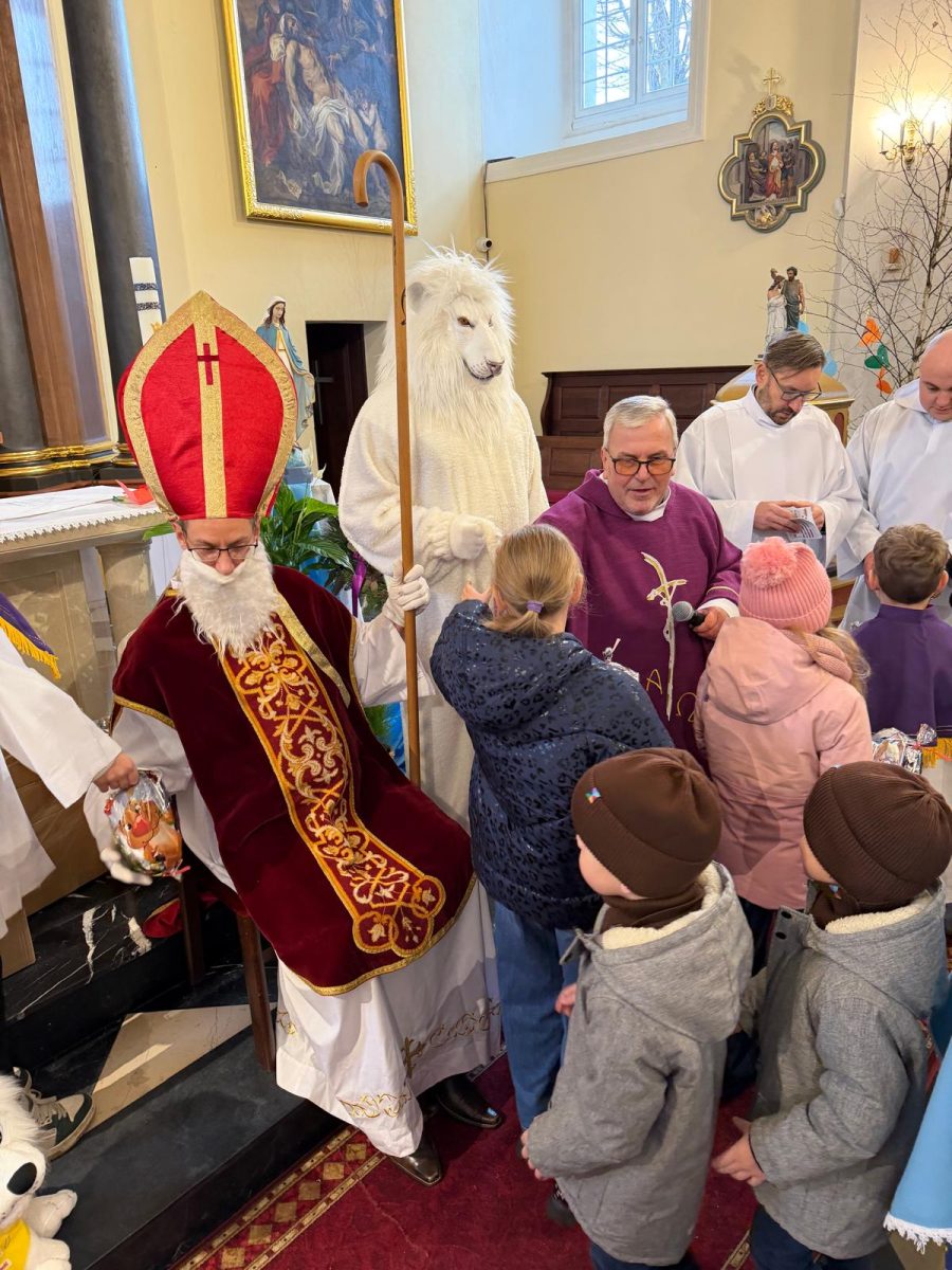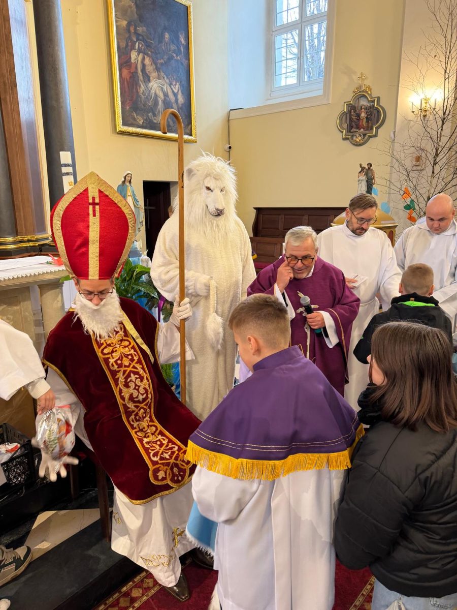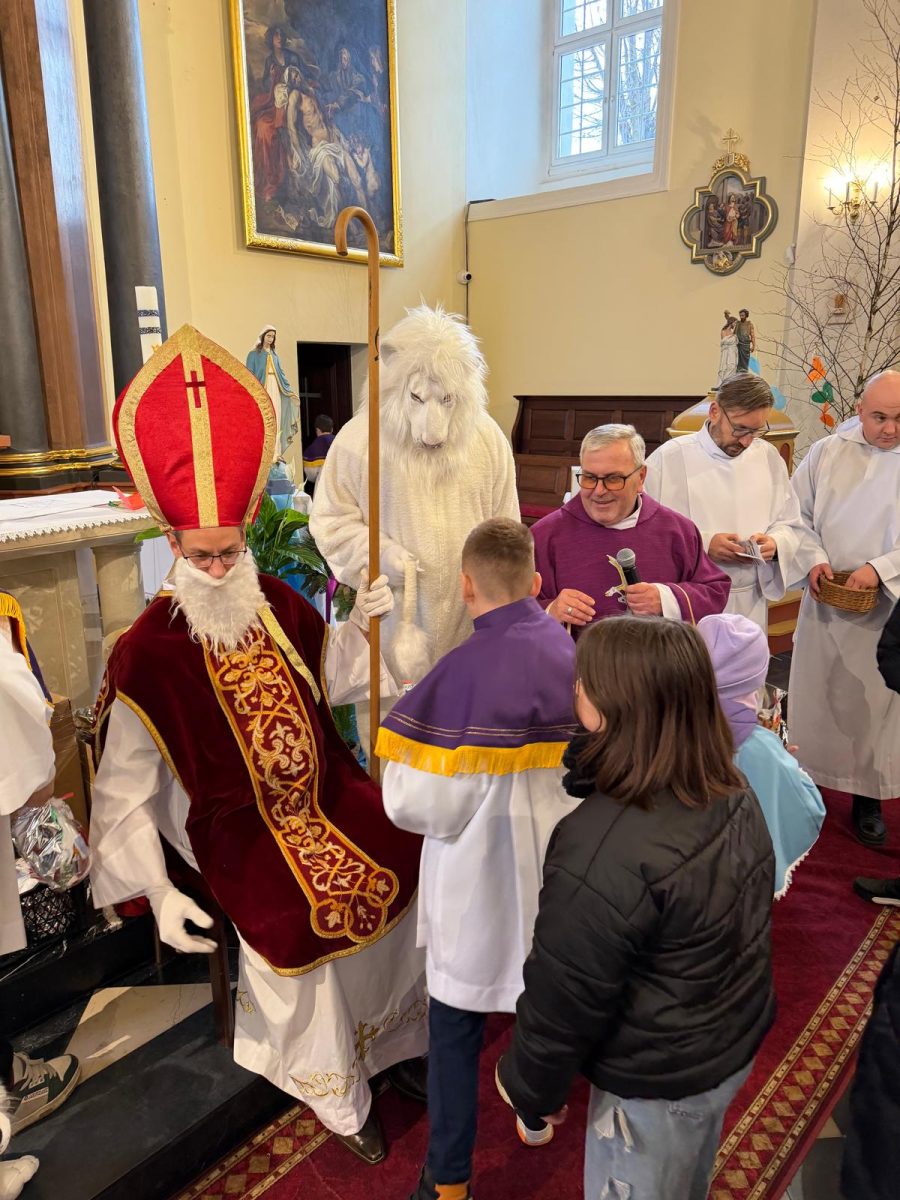Podczas Mszy św. o godz. 10:00 odwiedzili nas Goście. Przyszedł Św. Mikołaj, a przyprowadził go Lew Leo, a był po niego z zaproszeniem do naszej parafii w Turcji. 07.12.2025 r.